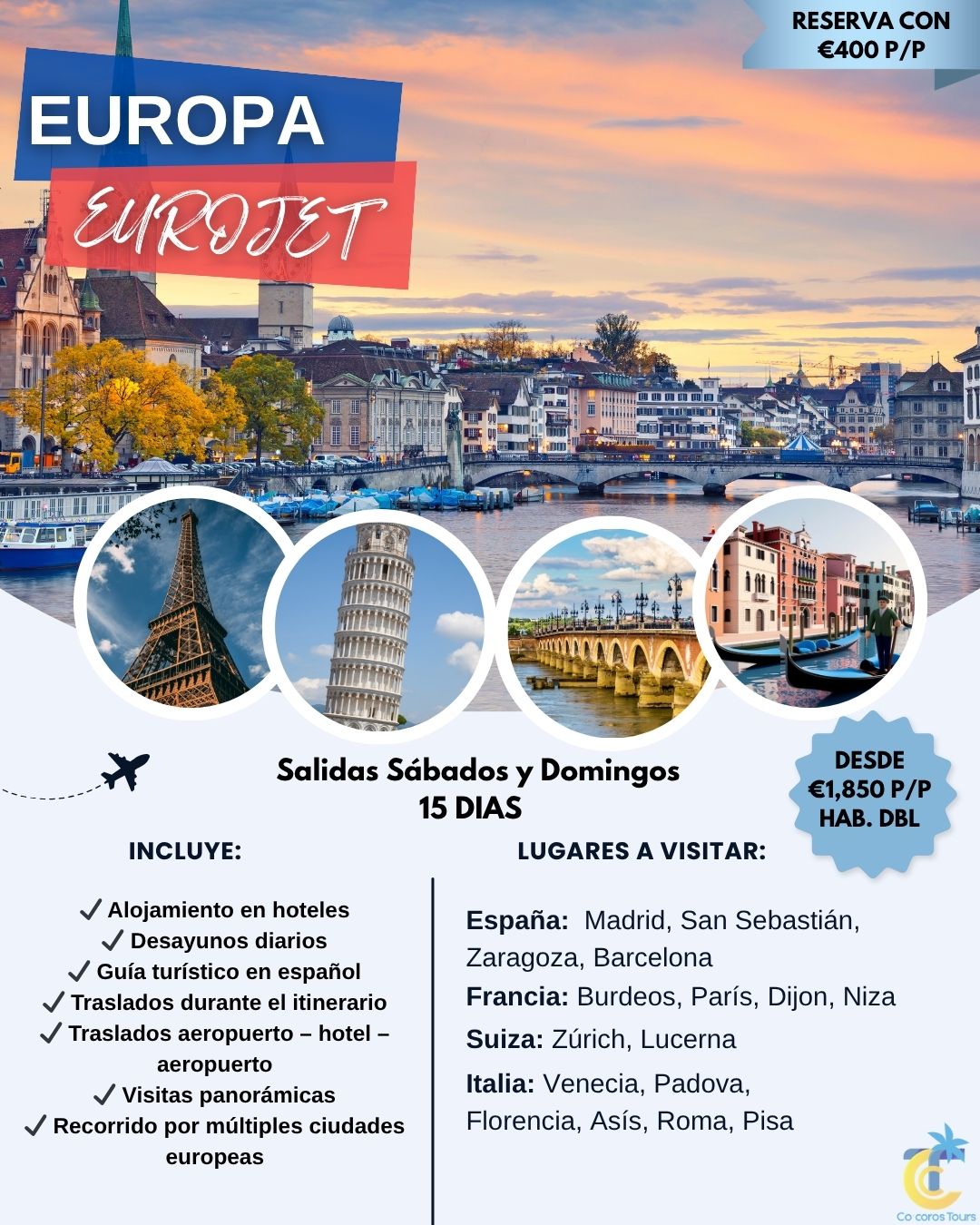 Descubre lo mejor de Europa en un recorrido inolvidable visitando ciudades icónicas llenas de historia, cultura y paisajes impresionantes. Este itinerario te llevará desde la vibrante Madrid, pasando por la elegancia de París, los encantos de Suiza, la magia de Venecia, el arte de Florencia y la majestuosidad de Roma, hasta finalizar en la dinámica Barcelona.